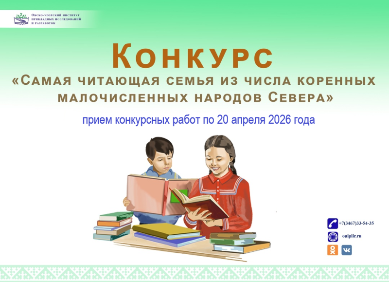 25 марта 2026 года БУ ХМАО-Югры «Обско-угорский институт прикладных исследований и разработок» объявляет о начале конкурса «Самая читающая семья из числа коренных малочисленных народов Севера», который проводится в рамках мероприятий по пропаганде чтения обско-угорской и самодийской литературы и фольклора коренных малочисленных народов Югры, развития семейного чтения и литературного творчества.